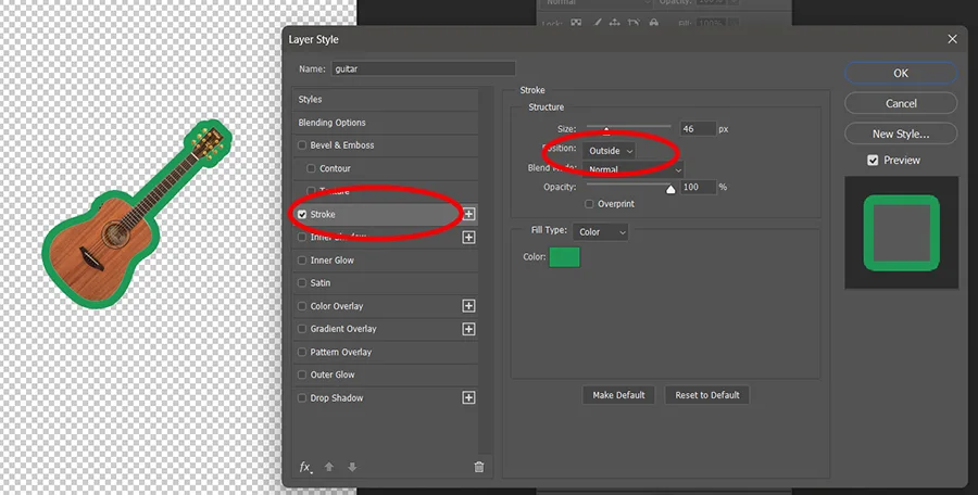 Stroke is another effect you can apply to the image in the Layer Styles panel. From the “Position menu”, chose “Outside” to add a border to help define the image in the collage.