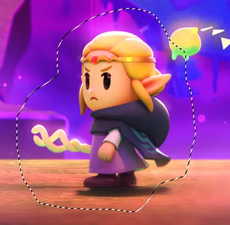 Hold down the left mouse button and drag the tool around the object. In this example, we drew around Zelda from Echoes of Wisdom to select her character and some of the setting. Importantly, we want to delete the other parts of the image, so we need to inverse the selection. You can do this by going to “Select > Inverse selection” on the top menu. You should see the lines shift to take account of the space outside the part of the layer you want to keep.