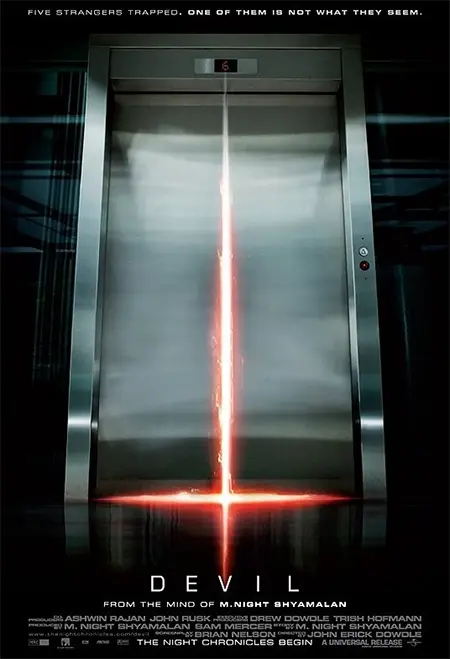 The official movie poster for Devil (2010) features a really effective mixed sign to grab our attention. On the first level of meaning, the reddish glow at the centre of the composition could literally point to an emergency light from inside the elevator (index), making the audience question what dangers are beyond the door. It also looks like an upside-down cross (icon). Crosses are a widely recognised symbol of Christianity so this representation is subverting the denotation.